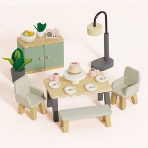 Feast your eyes on this stunning toy dining room set, the perfect addition to add a touch of modern elegance to any home of miniature. Stylish and sustainable, this 18-piece set features a smart wooden table with two coordinating chairs plus a bench, a freestanding lamp, a sideboard, 2 pot plants with realistic felt le