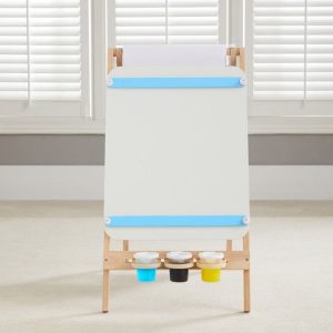 Get your little artist creating with our Easel Does It!  Our wooden easel sits neatly on the floor, and comes with a paper roll, 4 giant circle magnets to hold papers on to the magnetic chalkboard, and 3 paint cups. Flip sides, and you have a dry erase board.  Cup holders and shelf fit easily…