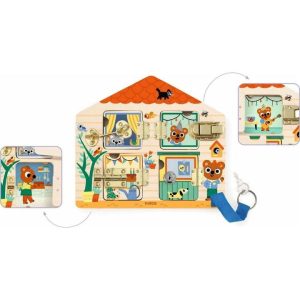 A house-shaped dexterity game where children learn to open and close locks. Discover the little cat's birthday party in pictures. For ages 3 and up, Cabanalock supports your child in the early learning stages. A wooden house with 4 windows that open and close. Four metal locking systems: a key, a latch, a hook and…