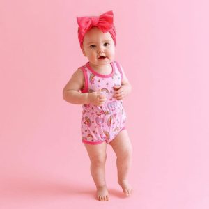 Sporty spice and everything nice in this fun little summer romper. Sleeveless detail & short leg opening with contrast binding, crew neckline, and a delicate elasticated gather at the waist. Snap closure at crotch for easy diaper changes. A Posh Peanut classic design! Sleeveless with scoop neckline and contrast tri
