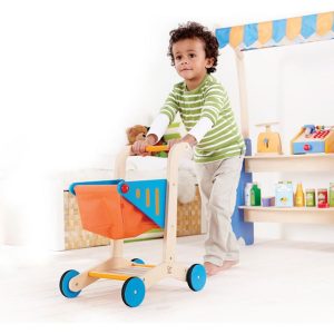 Scooting round the store with the most stylish wooden shopping cart. A fabric base adds extra room for all those supermarket goodies and a sweet little apple shaped chalkboard is perfect for writing a shopping list or drawing pictures. IT’S SHOPPING TIME – Gather up groceries and head to the checkout with this playful
