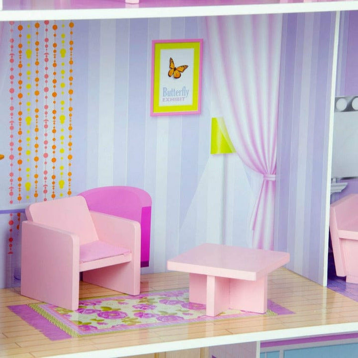 Give your child's doll collection a stylish place to stay with the Olivia's Little World Dreamland Tiffany Dollhouse. This modern dollhouse features a three-level design with a purple exterior and a rooftop area for a fun and colorful addition to any playroom. Complete with a kitchen, living area, bedroom, bathroom, an