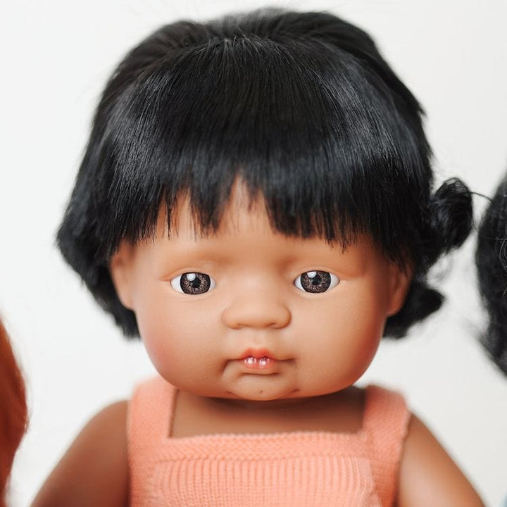 How does a child feel when they see themselves represented in a toy? This doll of Latin American origin with a salmon-colored romper helps boys and girls see themselves reflected in play. Finding a friend that helps them grow, understand diversity, and learn through pretend play makes this Latin American doll a perfect