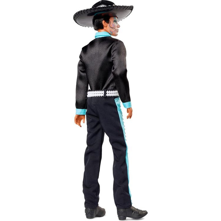 Celebrate the vibrant and beloved Mexican holiday with our 2024 Día de Muertos Collection. Ken doll looks striking in a black satiny suit with turquoise accents and embroidered details. He completes his look with calavera face paint, a silver belt, and a wide-brimmed sombrero. While sold separately, both Barbie and Ke