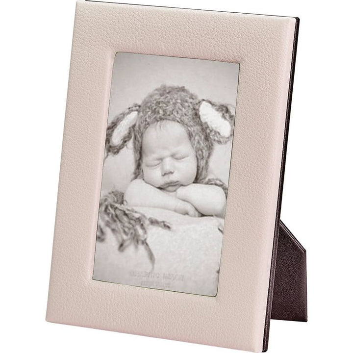 This rich leather frame beautifully accents your favorite photo. Handcrafted frames, wrapped in leather on both sides, with a sturdy metal easel. Convenient rear drop-down door for easy and frequent access to photos. Overall Size: 6" x 8" Opening: 4" x 6" full-grain leather