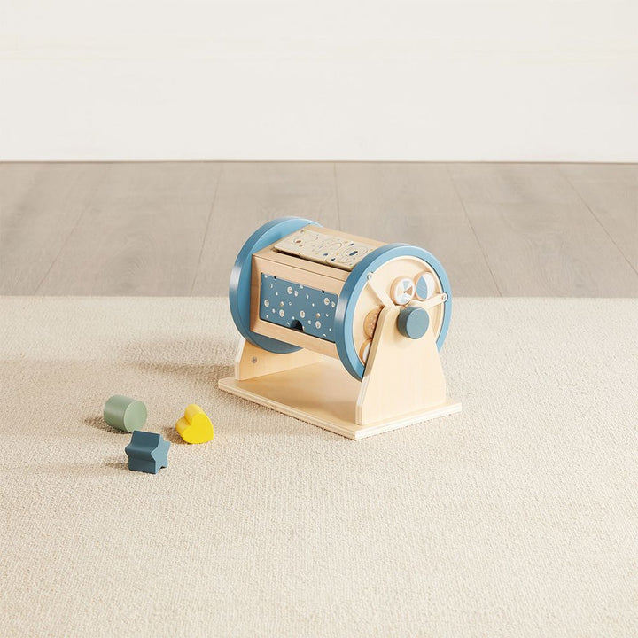Your baby will rock and roll with our wooden Activity Roller. This perfect tummy time toy can either sit in the base and whirl and twirl, or roll freely on the floor. This quality interactive toy features a shape sorter with heart, star and circle shapes and a functioning door that opens to store and retrieve shapes