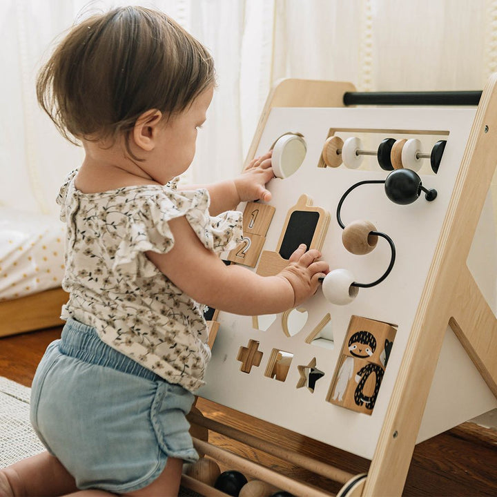Whether your little one is a sitter, squatter, stander or walker, they will love our Awesome Activity Walker. The sitting baby can sort the 6 shapes into the shape sorter, where the hidden shelf will catch the pieces. They can also play with the cell phone that fits into its own holder. Or try the squares that make cha