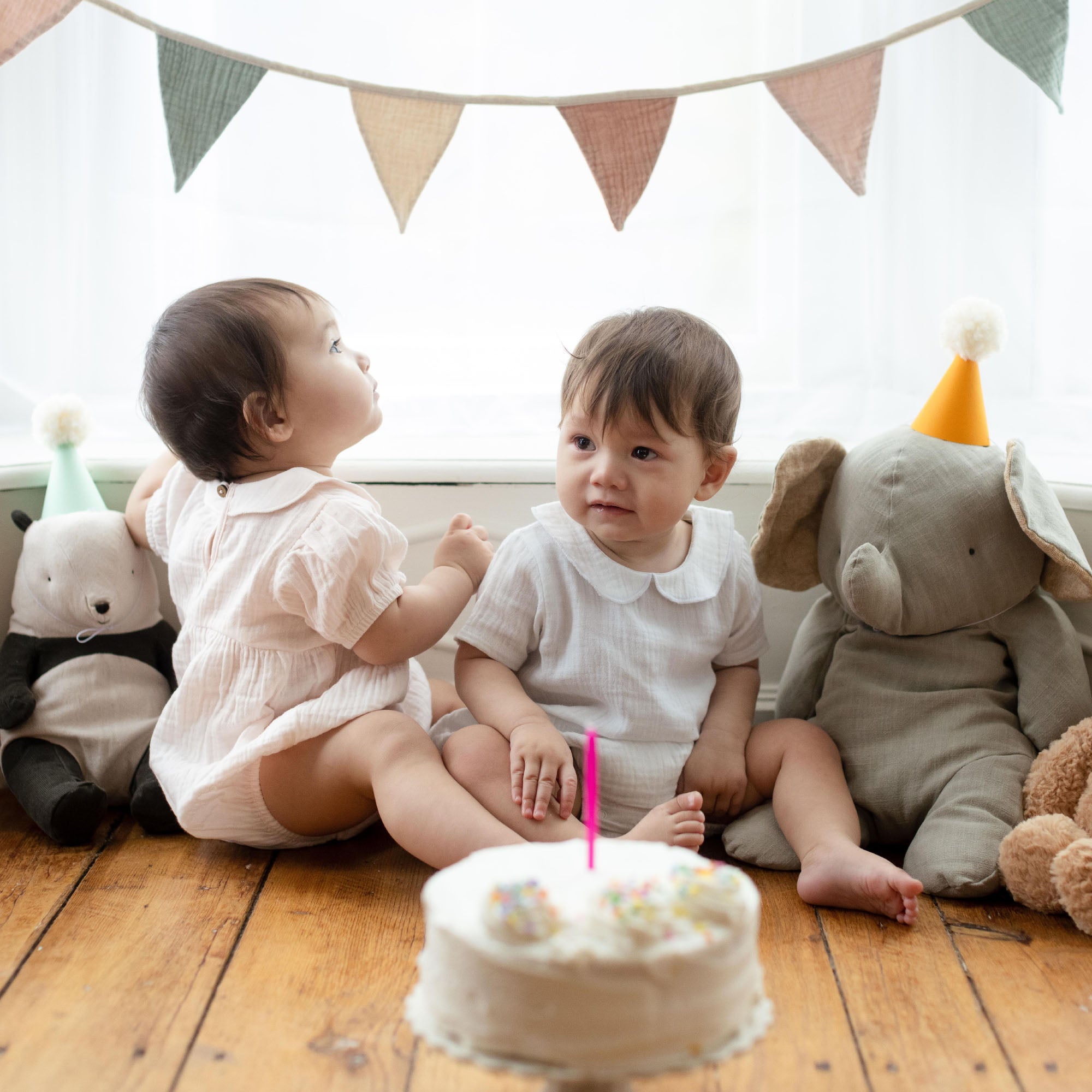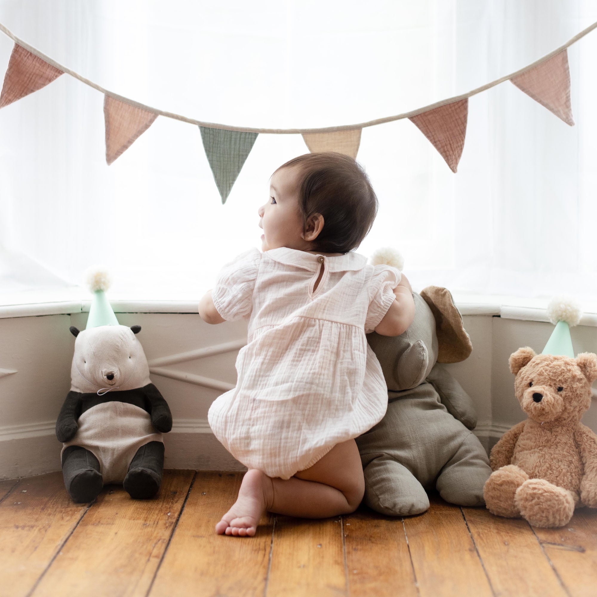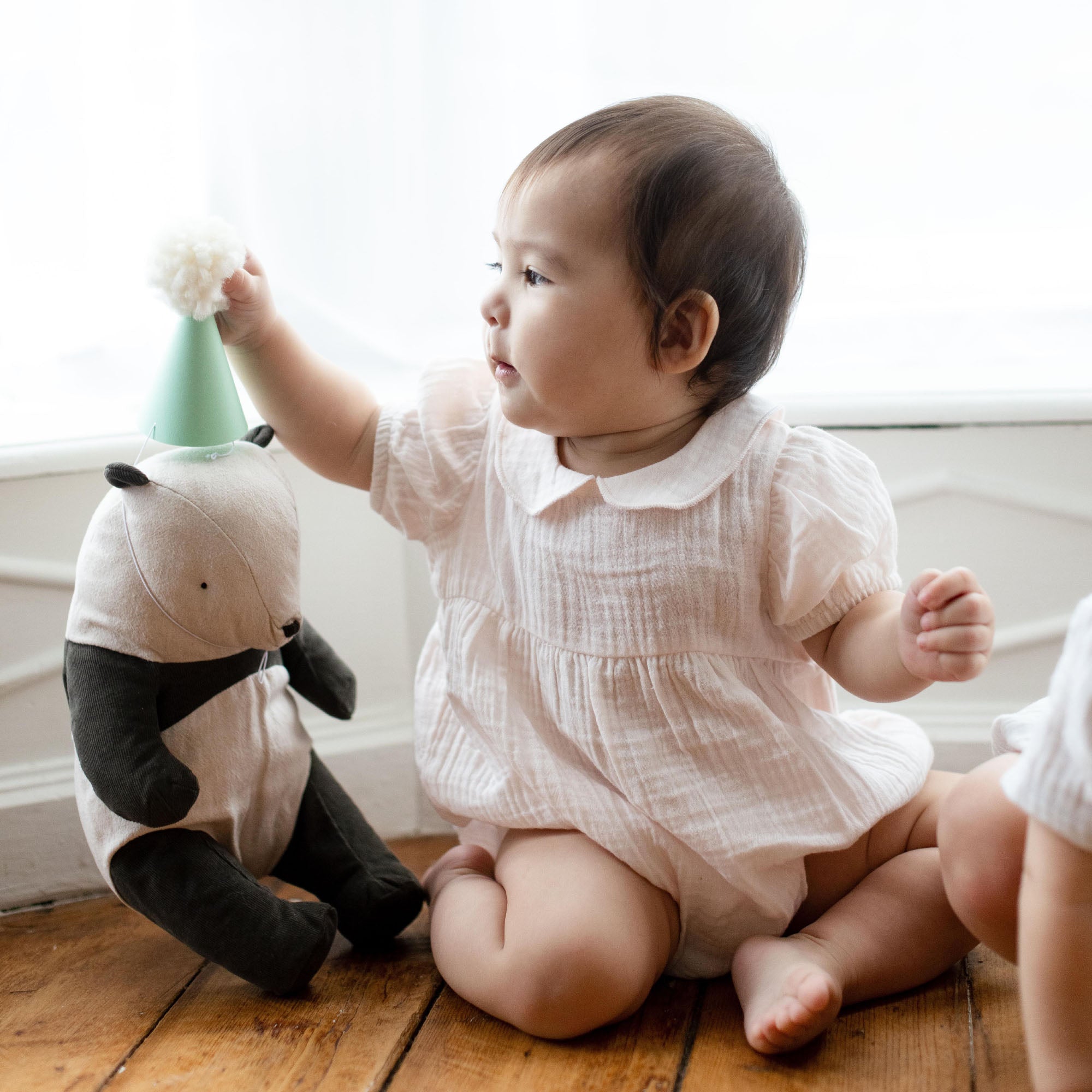Your baby will be picture-perfect in this airy pink muslin bubble featuring a delicate collar and gentle gathers for timeless charm.