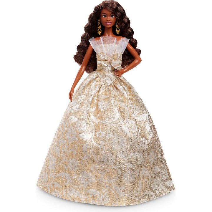The 2025 Barbie Holiday Doll is ready to embrace the delights of the season in style. She’s dressed for festive revelry in a voluminous gown with a silver and golden brocade pattern – an homage to holiday décor. The dress is packed with glamorous details, including a dramatic tulle-accented neckline and an oversized bo