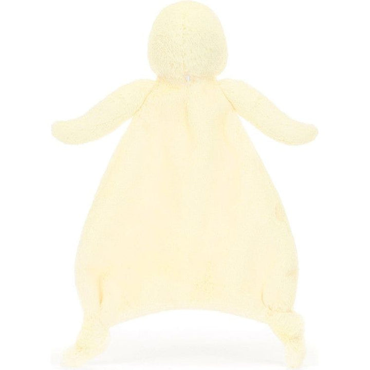 The Bashful Duckling Comforter is a portable patch of softness. Designed with an un-stuffed body yet delicately squashy paws and bobble feet, making it easy for little hands to grab hold of and comfort themselves. Please note: This product does not ship to Ohio or Massachusetts due to state regulations regarding recycl