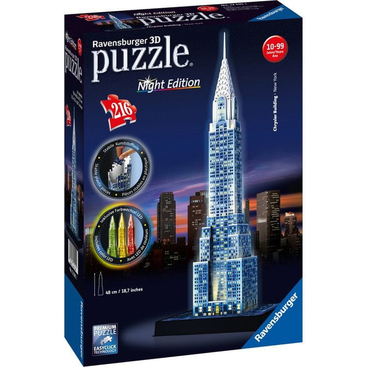 Utilizing the latest 3D puzzle technology you can create this stunning 3D model of New York's Chrysler Building. This "Night Edition" Chrysler Building 3D puzzle uses LED technology to create 2 different lighting effects. It can either be set to a steady warm white glow or can be set to alternating colors, continually