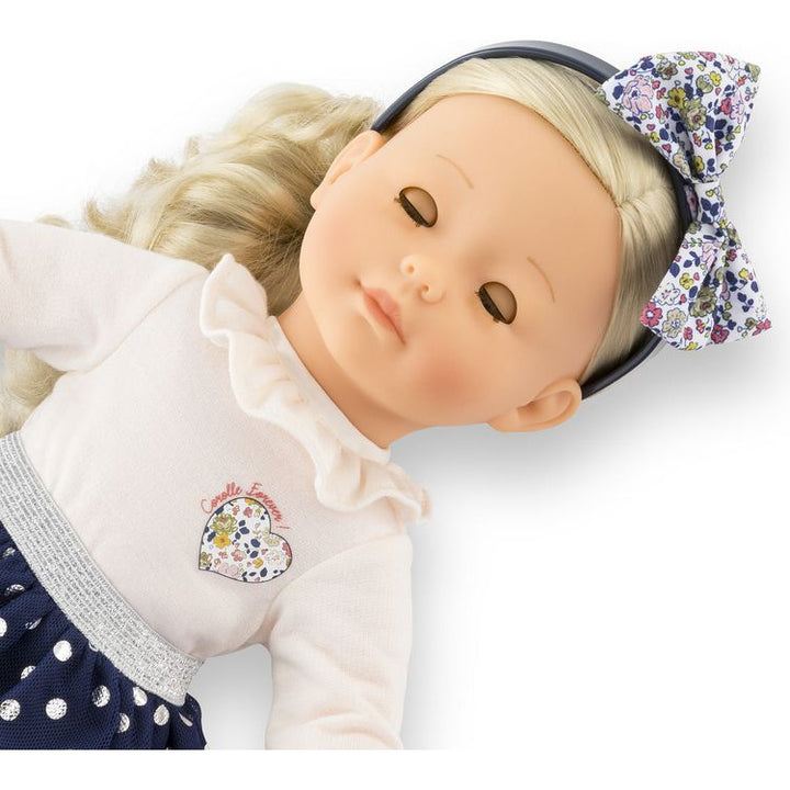 Cléophée is a 14 inch doll. She has a soft "underwear effect" body and long, curly blond hair that is easy to style. A doll with light skin: her face, arms and legs, with a delicate vanilla scent, are made of soft-touch vinyl. She closes her blue eyes when you lay her on her back. Cléophée is dressed in a pretty beige