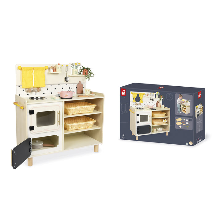 Guests are arriving, so get cooking! With their large wooden kitchen, children can imagine delicious recipes at the stove and imitate the grown-ups, from age 3 upwards. Equipped just like a real kitchen and with 16 accessories, this toy kitchen is perfect for playing dinette and inventing all kinds of stories and dishe