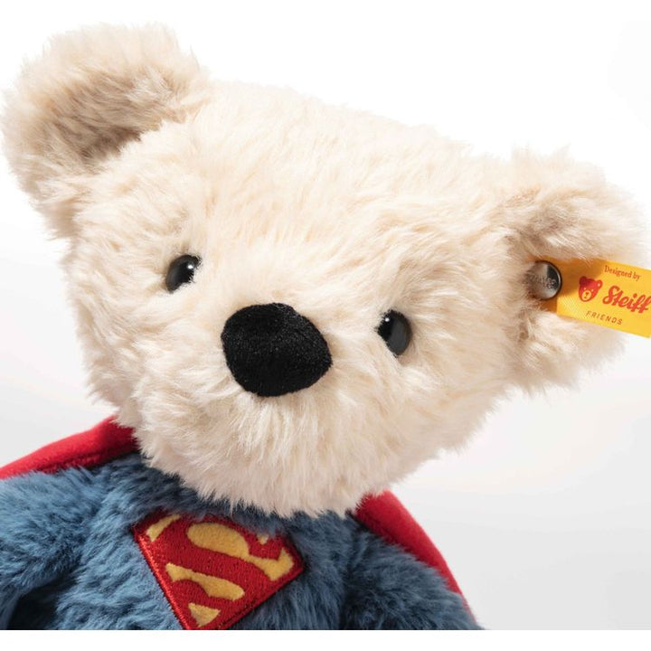 Bring superhero adventures to life with the DC Superman Teddy Bear! Measuring 12 inches tall, this cuddly plush bear is dressed just like the legendary Superman, complete with a blue suit, red cape, belt, and embroidered S-Shield emblem. Soft and huggable, he’s perfect for saving the day during playtime or snuggling up