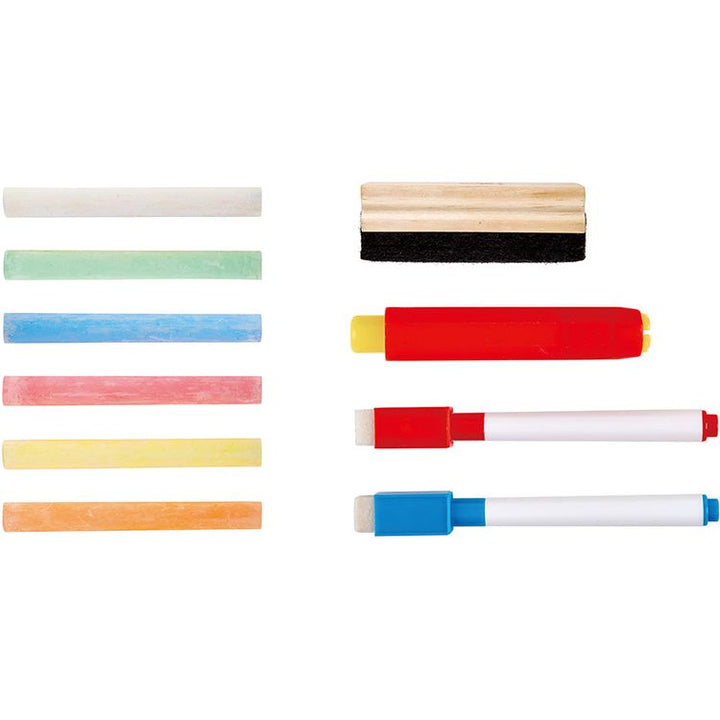 Hape's Flip Flat Wooden Easel is the ultimate arts and crafts toy for kids. Flip the double-sided easel with a whiteboard on one side to reveal on the other side, a chalkboard – both are ideal for drawing or learning and clean easily. This kid’s art easel allows your kid to paint, write or draw with chalk, making it th