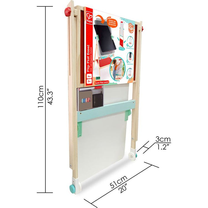 Hape's Flip Flat Wooden Easel is the ultimate arts and crafts toy for kids. Flip the double-sided easel with a whiteboard on one side to reveal on the other side, a chalkboard – both are ideal for drawing or learning and clean easily. This kid’s art easel allows your kid to paint, write or draw with chalk, making it th