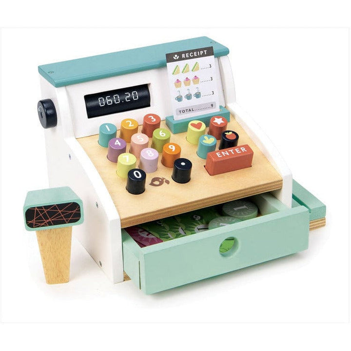 Ring up all your groceries with this fun and colourful wooden till with scanner. Slide your credit card along the groove, pop one of 5 printed receipts into a slot, turn the little knob to show different prices through a window, press down on the multi-coloured squidgy buttons and open the tray to dispense 5 wooden coi