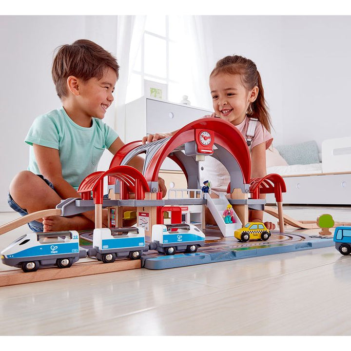 Visit the world’s most exciting destinations with this bustling two-level station! It has a projector that displays images of big global cities when five special tickets are inserted, plus a recorder for station announcements. Two-level station kit Includes recorder for station announcements, destination projector and