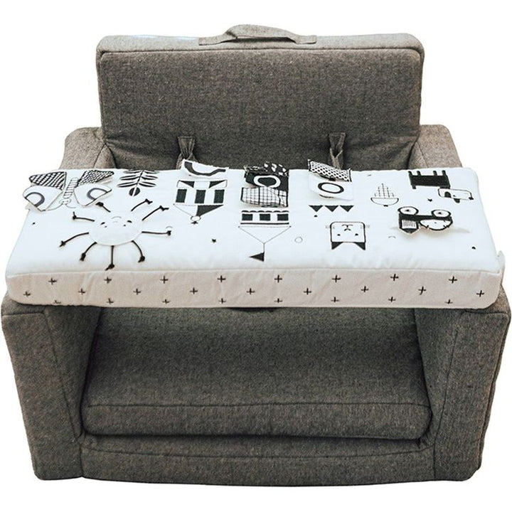 It’s hip to be a square…chair, that is. Our Square Chair is the perfect place for baby to hang out (when they are able to sit up by themselves) and play with all of the interactive toys on the tray. They will delight in the sounds of the crinkle, peek-a Ages 5 MONTHS+ Material: Polyester and cotton Care Instructions: