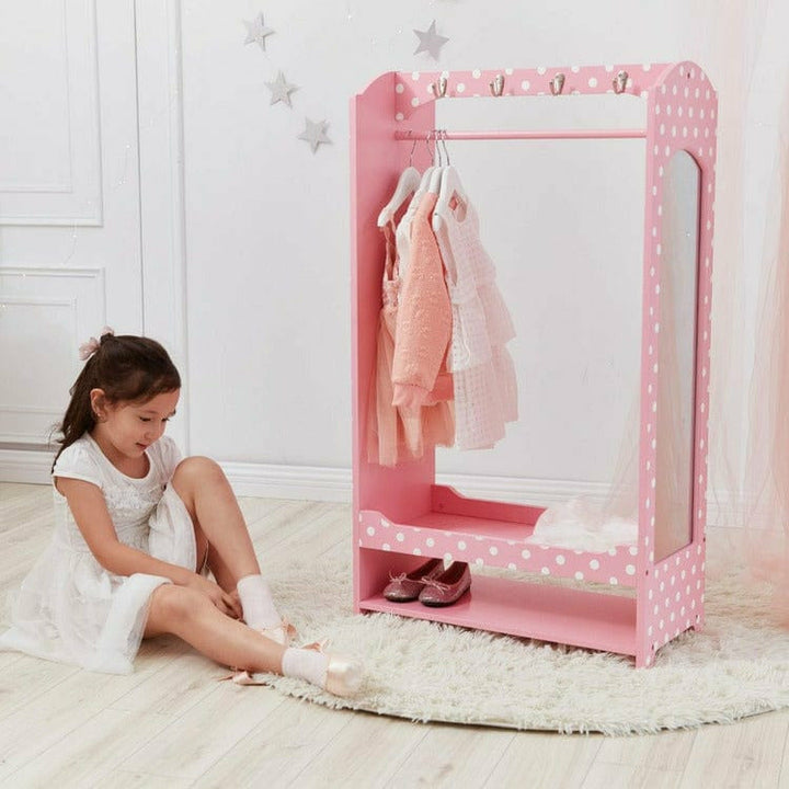 Make getting ready more magical for your little one with the Fantasy Fields Bella Polka Dots Toy Clothing Rack with Storage. This colorful and durable storage system features a pink design with white polka dots and contains ample space for your child's wardrobe. The Fantasy Fields Polka Dots Toy Clothing Rack with Stor