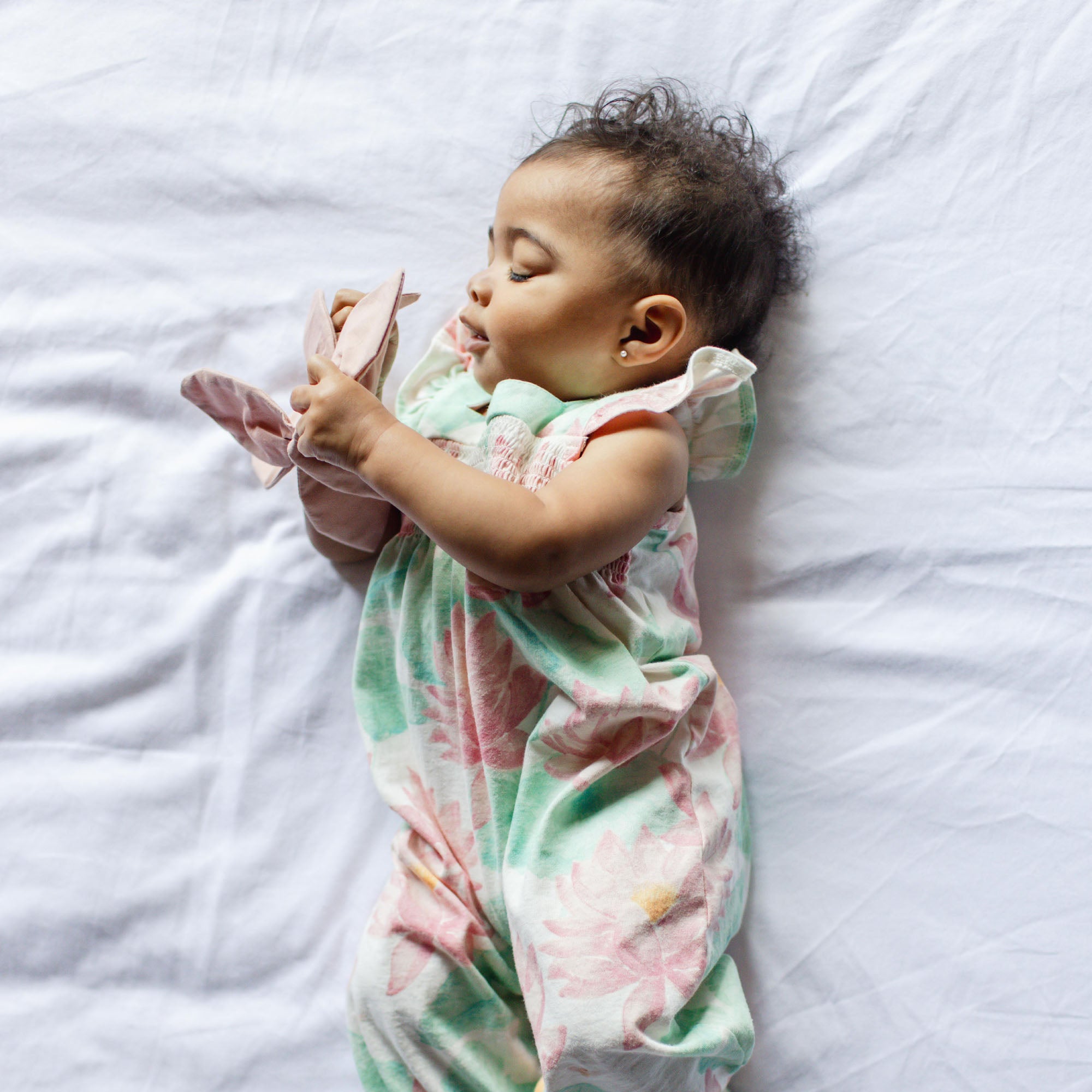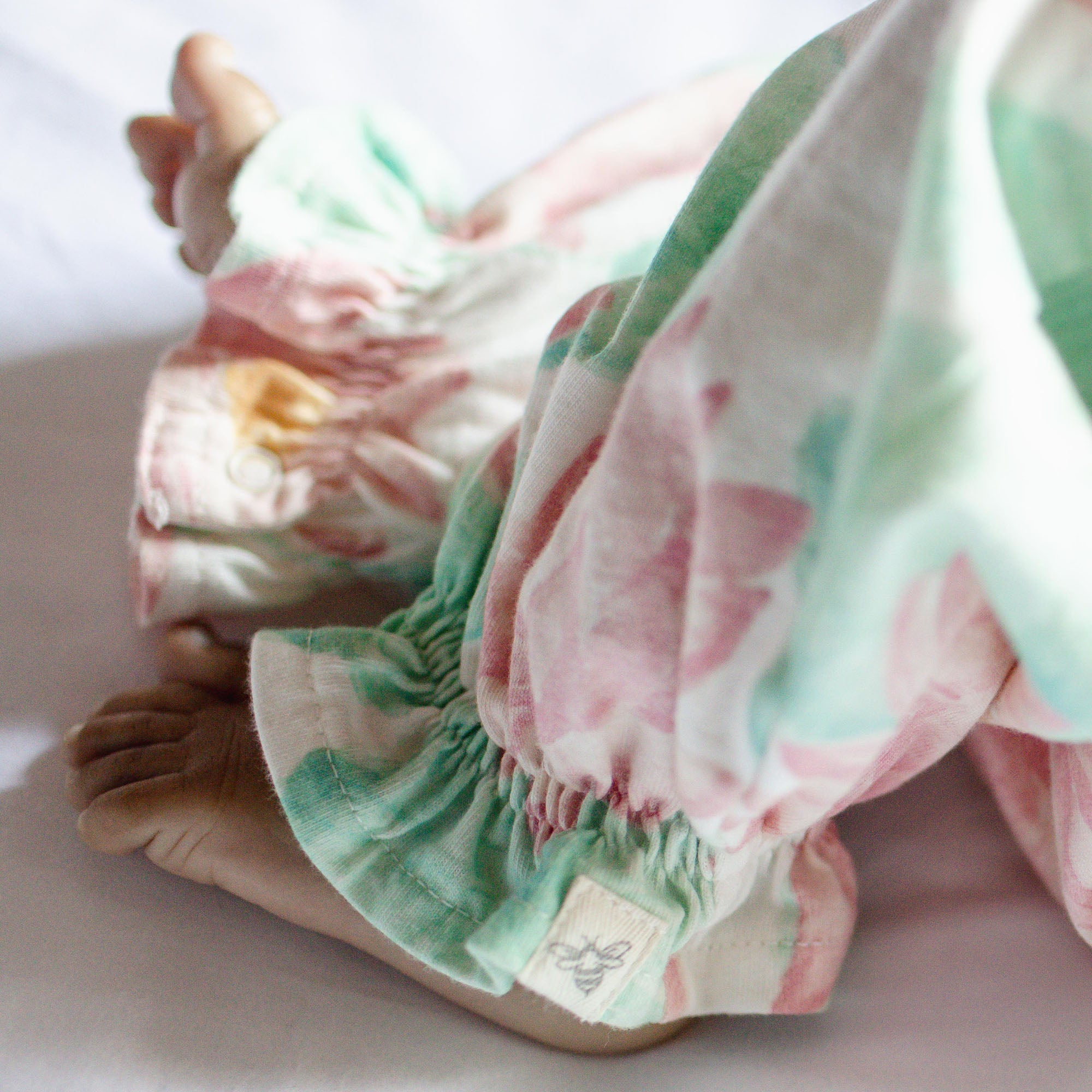 Long legs and delicate smocking with pretty straps make this lotus-print jumpsuit a cozy. charming choice for everyday adventures and special moments.