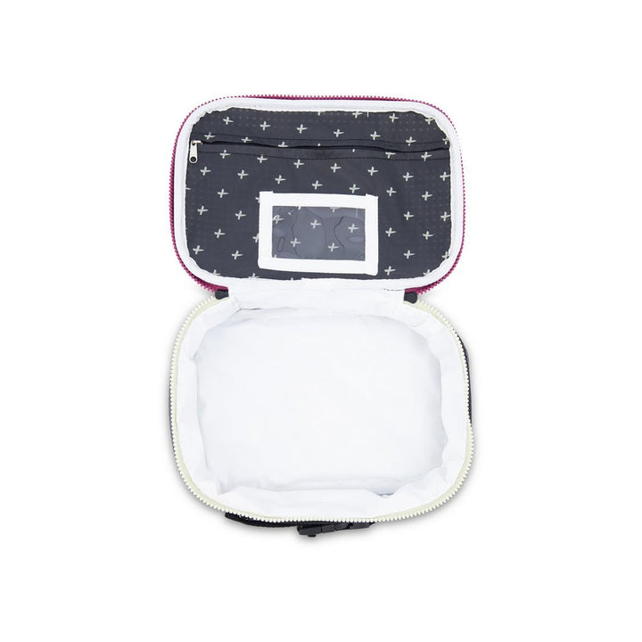 The insulated lunch tote keeps food hot or cold and is easy to carry with you to school. Insulated to keep food hot or cold Easy to carry handle Name tag Buckle to clip lunchbox onto your bag Fits most containers and bento boxes. Fits into all of our backpacks except the little miss Size: 10" W 7" H X 3.5" D + Contents