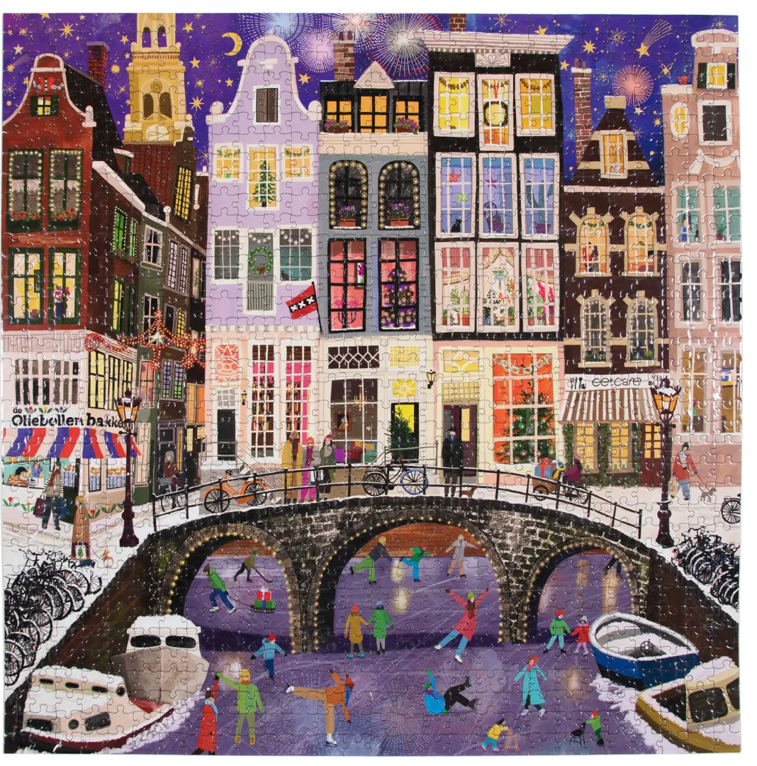 Welcome to the Netherlands! This 1000-piece puzzle will transport you straight to Magical Amsterdam: wander the snowy streets. smell the freshly made ‘Oliebollen’ (donuts). and get your ice skates on upon the frozen canal. Each piece placed will take you closer to experiencing this Dutch treasure from the comfort of your home.