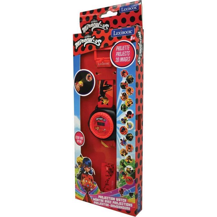 A digital watch with Miraculous design! 20 images of lady bug universe to project wherever you want Communicate with your friends by sending coded messages with your favorite screenings Adjustable strap, perfect for small wrists Rotating ring to choose the image to be projected Time and date display Dimensions: 5.31 x