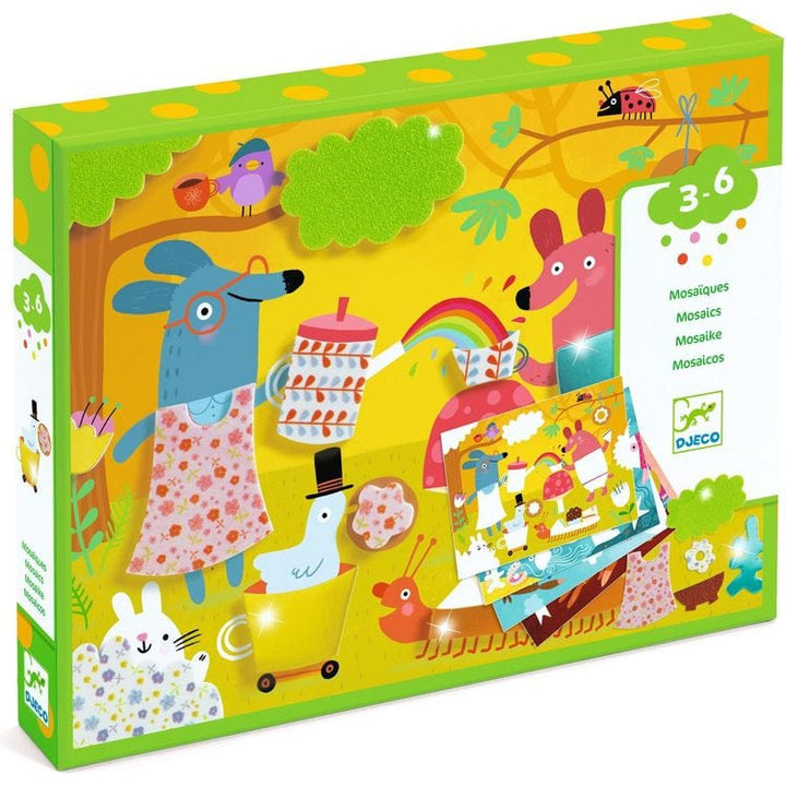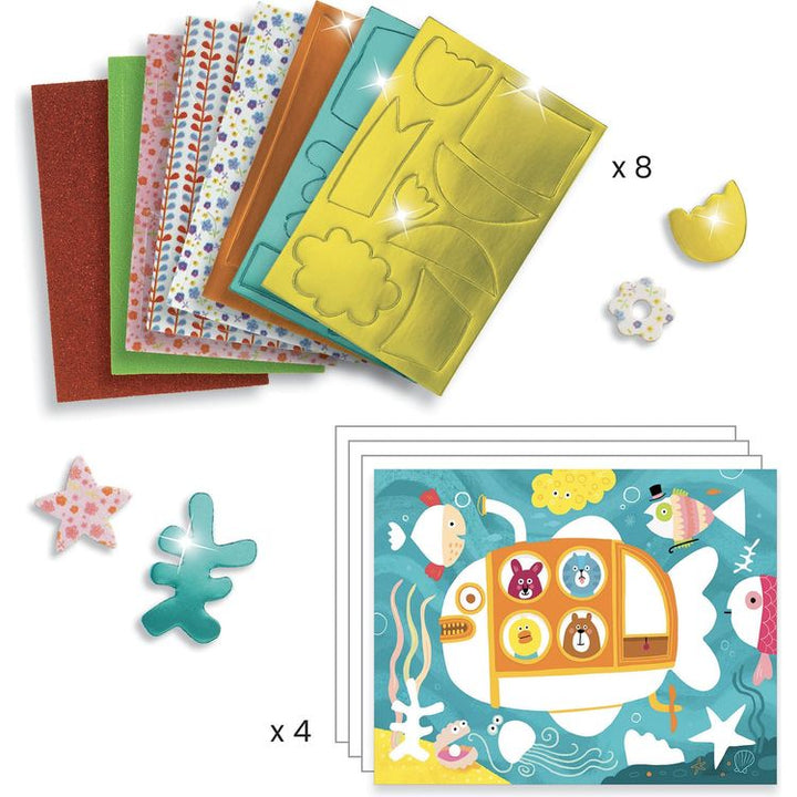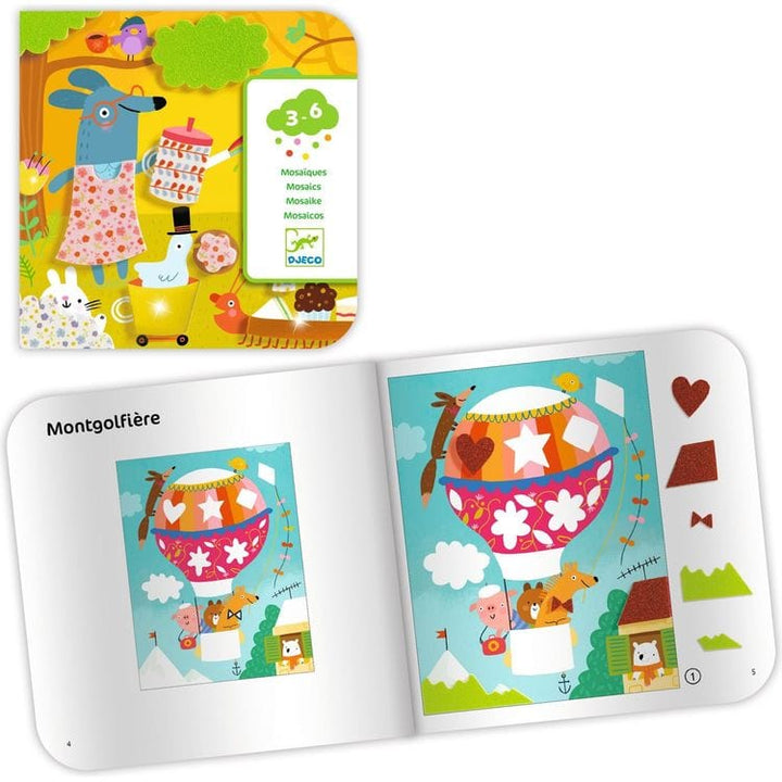 A collage activity to make 4 designs with printed, glittery, and metallic self-adhesive foam pieces. An introduction to mosaics, where the child sticks pretty foam shapes on really funny illustrations. Printed, metallic and glittery self-adhesive foam pieces. An explanatory booklet in color with pictures only. Develops