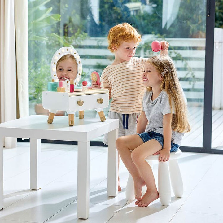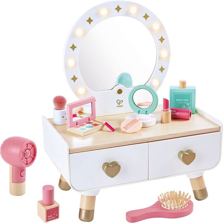 Introduce your child to beauty with this stylish dressing table. Fostering creativity and fine motor skills, children explore makeup artistry, encouraging self-discovery and confidence. This elegant dresser features lights, a mirror, a functional hairdryer, and various makeup pieces that can be neatly stored in the two