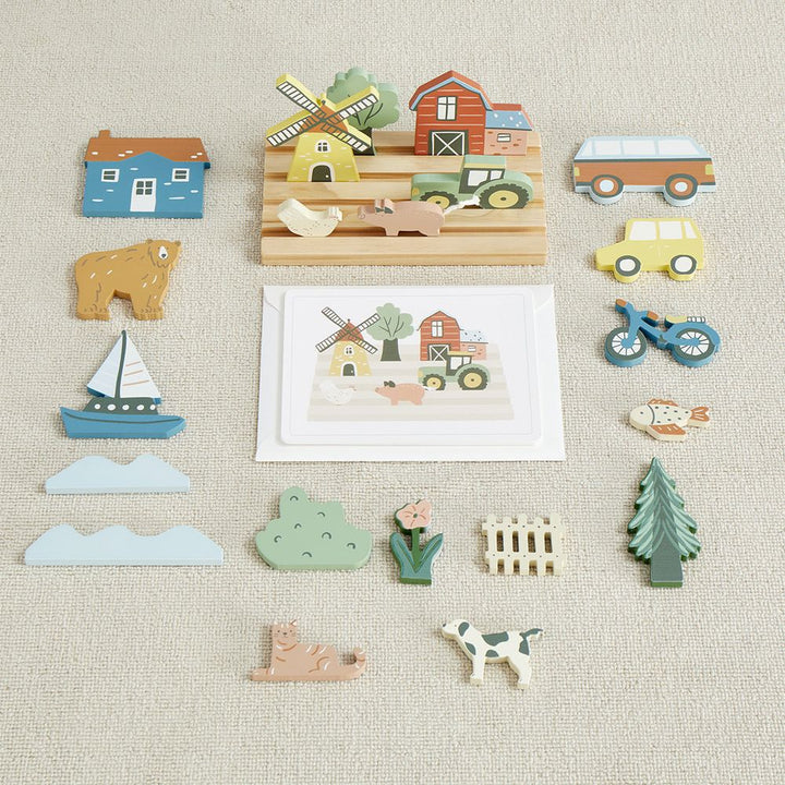 Our My Town Picture Matching Game is a great and fun way to help your kiddos learn placement and sequencing by matching the wooden objects to the pictures.  Our high-quality  set includes a chunky wooden base that holds 21 assorted vehicles, trees, houses, bikes and more.  12 cardboard pictures with scenes to match.  L