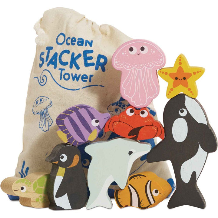 Dive into aquatic fun with this sweet animal stacking toy, made from durable FSC™-certified wood. Each stackable character features a lovely painted design, using water-based, child-safe colours and includes all familiar sea life favourites. There’s even a handy cotton drawstring bag to keep them safe when not in us Se