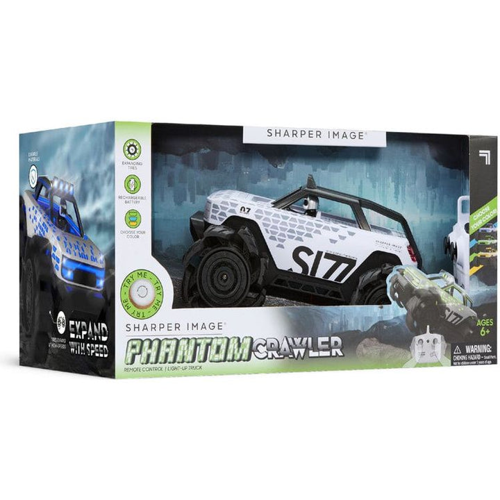 Introducing the Sharper Image® Phantom Crawler RC Light-Up Truck, designed to dominate any terrain with its innovative expanding tires. These oversized tires adjust to provide superior traction and stability, making every adventure possible. Stand out on the track with color-changing lights that let you choose between