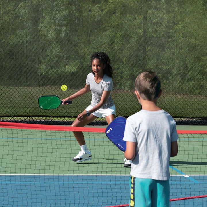 Looking for a pickleball starter kit? This set has everything you need to jump into the game. Featuring two durable wooden paddles with non-slip grips, two USPA-approved pickleballs and a shoulder carrying bag, it’s perfect for beginners. With eye-catching paddle designs, kids will feel confident and ready to play! EAS