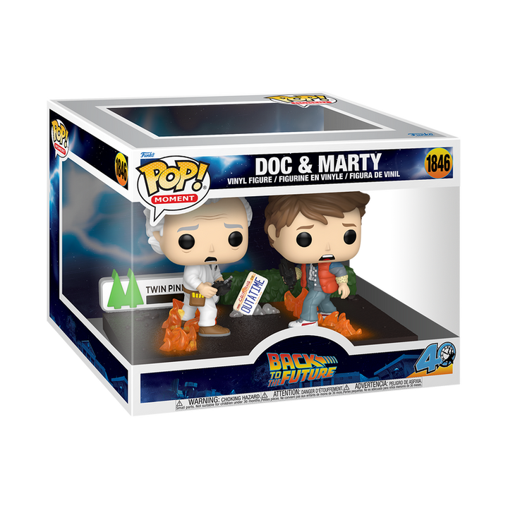 Buckle up for an electrifying trip to the past with POP! Doc and POP! Marty! This POP! Moment features the Time Machine’s burning tire tracks, following its first successful travel through time. Celebrate the 40th Anniversary of Back to the Future by adding this time-traveling duo to your POP! Movies collection! Vinyl