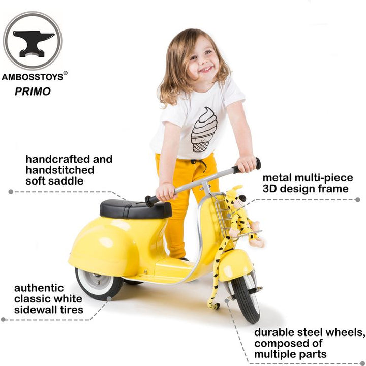 PRIMO is the ultimate toy, as our frame is built for longevity with only durable and high-quality materials. Safety and quality are our top priorities, making the self-propelled PRIMO ride-on scooter ideal for one year old up to 5 years old. Our frame consists of solid metal sheets, welded by hand out of several indivi