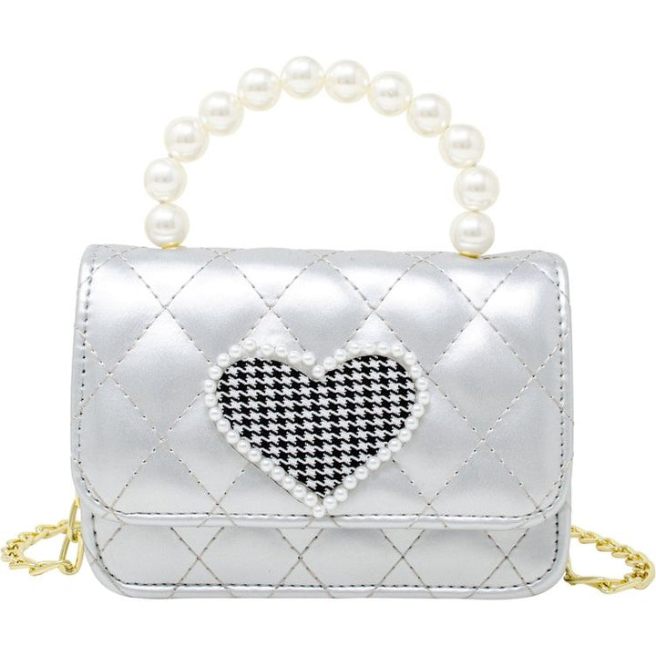 This Quilted Pearl Handle Heart Bag will have your little one feeling like royalty! Its chic houndstooth heart patch and pearls make it a stylish accessory, while the gold chain strap gives it a luxe touch. Perfect for any princess! Magnetic closure Goldstone hardware Pearls for handle   Dimensions: 6L x 2.5W x 4H (inc