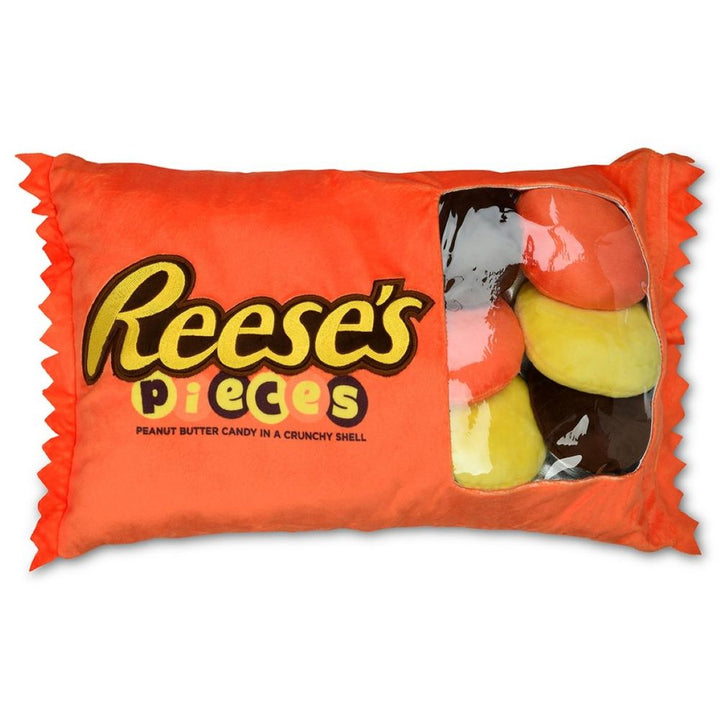 This full color, officially licensed pillow is comprised of a fleece zipper closure bag with a clear window in the front to show the five plushie Reese's Pieces candy pillows inside Includes 6 removable pieces Fleece material REESE’S trademark and trade dress are used under license Dimensions: 19" w x 11" h x 3" d Ages