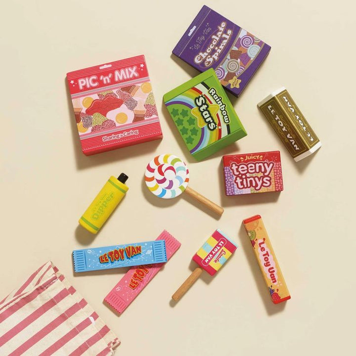 Take a trip down memory lane with this nostalgic Pic 'n' Mix set, made for retro role play fun. Sweet tooth's will delight at this cute set which features an assortment of tasty treats plus a stripy sweetie bag for all the fun without the sugar rush! Each wooden toy sweet is beautifully decorated with unique illustrat