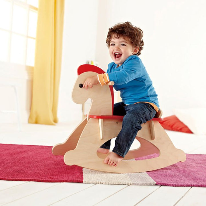 This perfectly-balanced ride-on can take kids for a slow-and-steady trot or a rocking gallop. The backrest can be lowered when your toddler is ready to rock and ride on their own. Long-lasting toy your child will love for years to come. A guardrail helps babies from 10 months+ stay in place and can be removed as they g