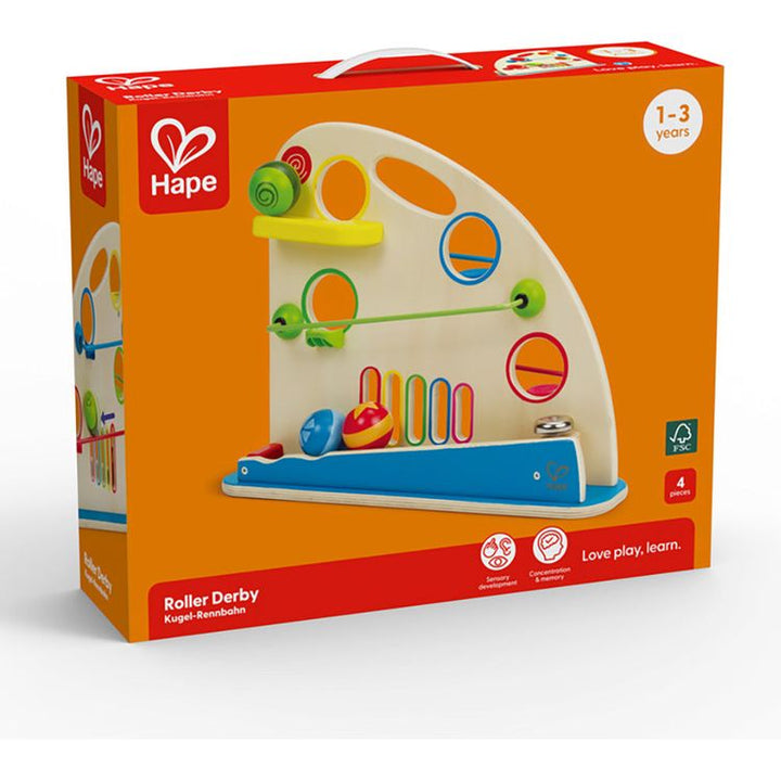 Hape’s Roller Derby creates an exciting world of fun of colorful wooden balls, peek-a-boo holes and fast tracks as the balls roll down the track in and out of site of the two-sided maze. The Peek-a-Boo hole on the top doubles as a carrying handle, making it easy to take out and tidy away. Discover the joy of guiding ob