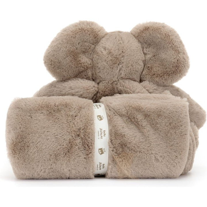 Smudge Elephant Blankie is a gorgeous large blanket with elephant head and arms in luxuriously soft grey fur. A soft spot for resting or for tummy time, this blankie is tied with a grosgrain printed ribbon, and presented in an elegant Jellycat gift box with gift card and envelope. An indulgent gift for a new arrival. T