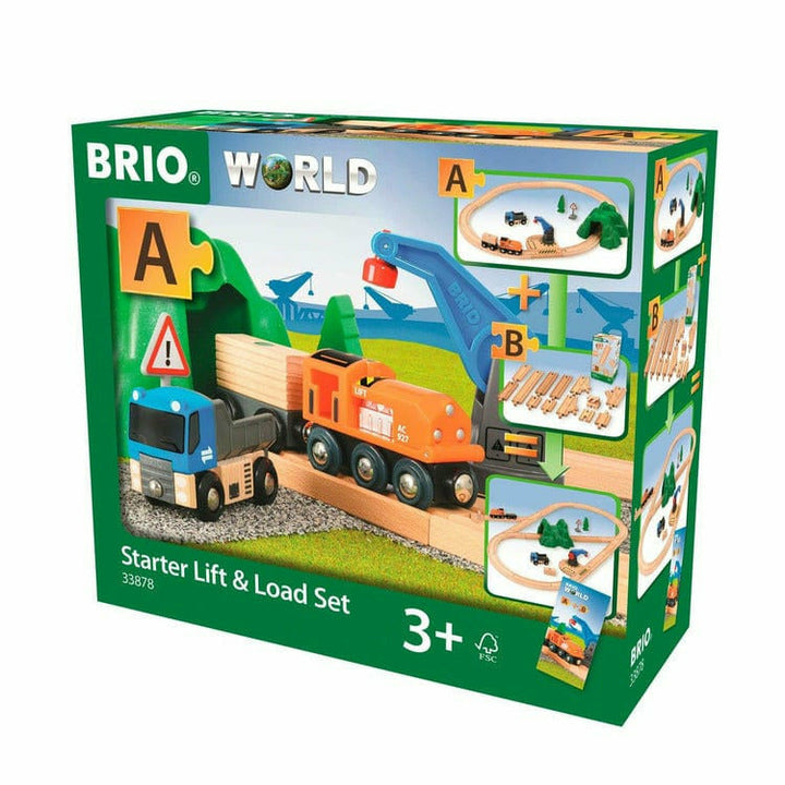 All aboard! Build your first BRIO World with this new lift and load starter wooden train set. The layout is packed with toys – a working crane, truck, a pop-up hood engine and wagon with load – even a warning sign, spruce and a small mountain to thunder through! Lift the cargo off the truck with the crane, turn and loa