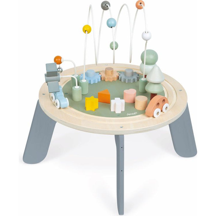 A multiactivity table adapted for toddlers, including: – a circular train rail with 2 vehicles – 2 stackable trees – 3 loops with beads, windmill and mini-bell – 3 gears to turn. 2 building options for the legs to assemble the activity table in either a high or low position. Board height low: 14/ high: 22.5 cm A range