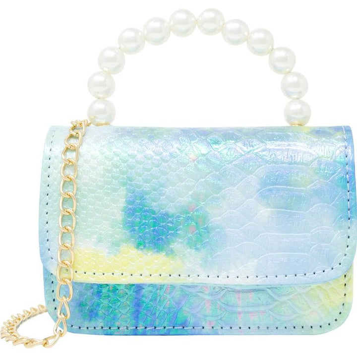 This stylish kids handbag has a crocodile texture and tie dye finish! It is the perfect accessory to complete any young fashionista's outfit. The handle is made with pearls, adding a touch of elegance, and the bag also comes with a chain strap for versatile wear. The flap closure is secured with a magnetic snap, making