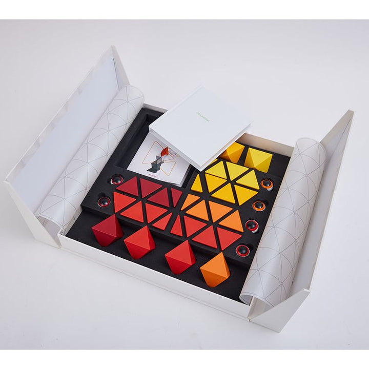Sunrise Large set, the red, dare to shine bright like the morning sky with Sunrise. First of its kind in 3D magnetic play, the 36-Pieces Set includes: 6 octahedrons, 12 tetrahedrons, 12 half-tetrahedrons, 6 eyes (in total 36 pieces) + Leaflet + Limited Edition "Inspiration Book" With a large set you can either build on