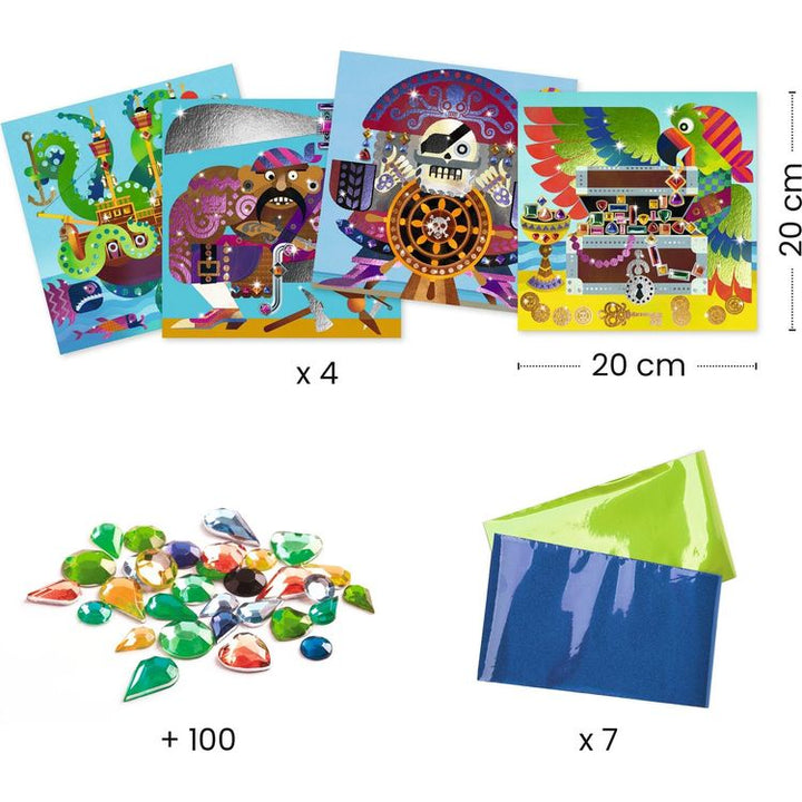 Prepare to board! A collage activity to decorate 4 pirate-themed pictures with foil and rhinestones. Identify where to place the foil using the color code shown on the boards. Using the tool, reveal the film protecting the glued surface and stick down the foil. The material settles like magic! Then, stick on the rhines