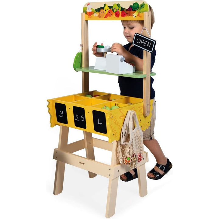 The small producers' market is open! Our wooden Farm Market is the ideal toy for children aged 3 years and up who’ll love pretending to run their own business. This beautiful pretend play toy is equipped with numerous accessories for an enriching and realistic play experience. A total of 58 accessories complete this ch